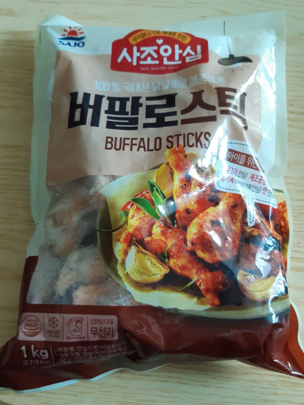 사조 버팔로스틱 리뷰 안녕하세요 펭펭무 입니다. 오늘은 마트에서 사조 버팔로 스틱이라는 제품을 사왔습니다. 배달로 치킨한번 사먹으려면 2만원돈이 나오니 좀 저렴하게 먹고싶었는데 버팔로스틱이 눈에 보이더라구요. 내용물은 1kg이고 가격은 13,000원 정도 였습니다. 사조 버팔로스틱은 닭고기 함량이 87%입니다. 냉동 후라이드 치킨이나 가라아게들은 튀김옷이 있기 때문에 이렇게 높은 달고기 함량이 되긴 쉽지 않아요. 버팔로 윙이나 구이로 된 치킨들만 이렇게 높게 달고기 함량이 나옵니다. 그 이외 재료들은 맛을 내기 위해 첨가되는 것 같습니다. 사조 버팔로스틱의 영양정보 입니다. 100g당 220kcal 라고 하니 전체 칼로리는 2,200kcal 입니다. 탄수화물과 당류는 각각 4g, 3g 이네요. 역시 튀김..