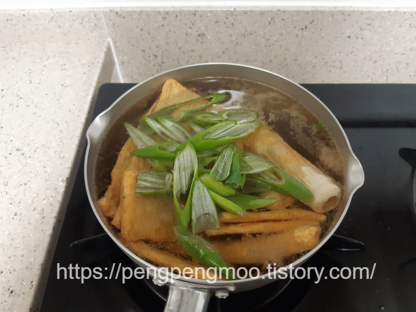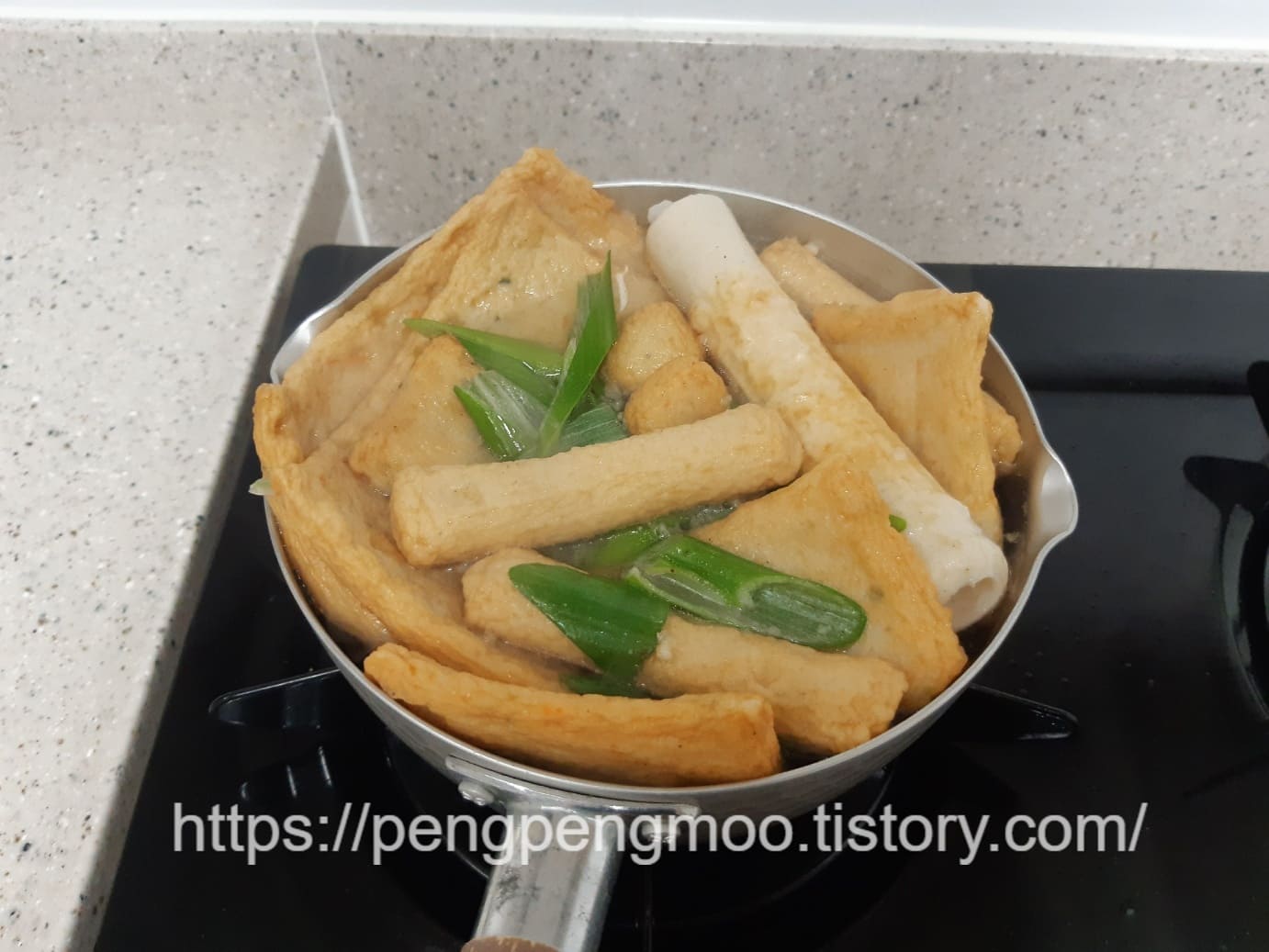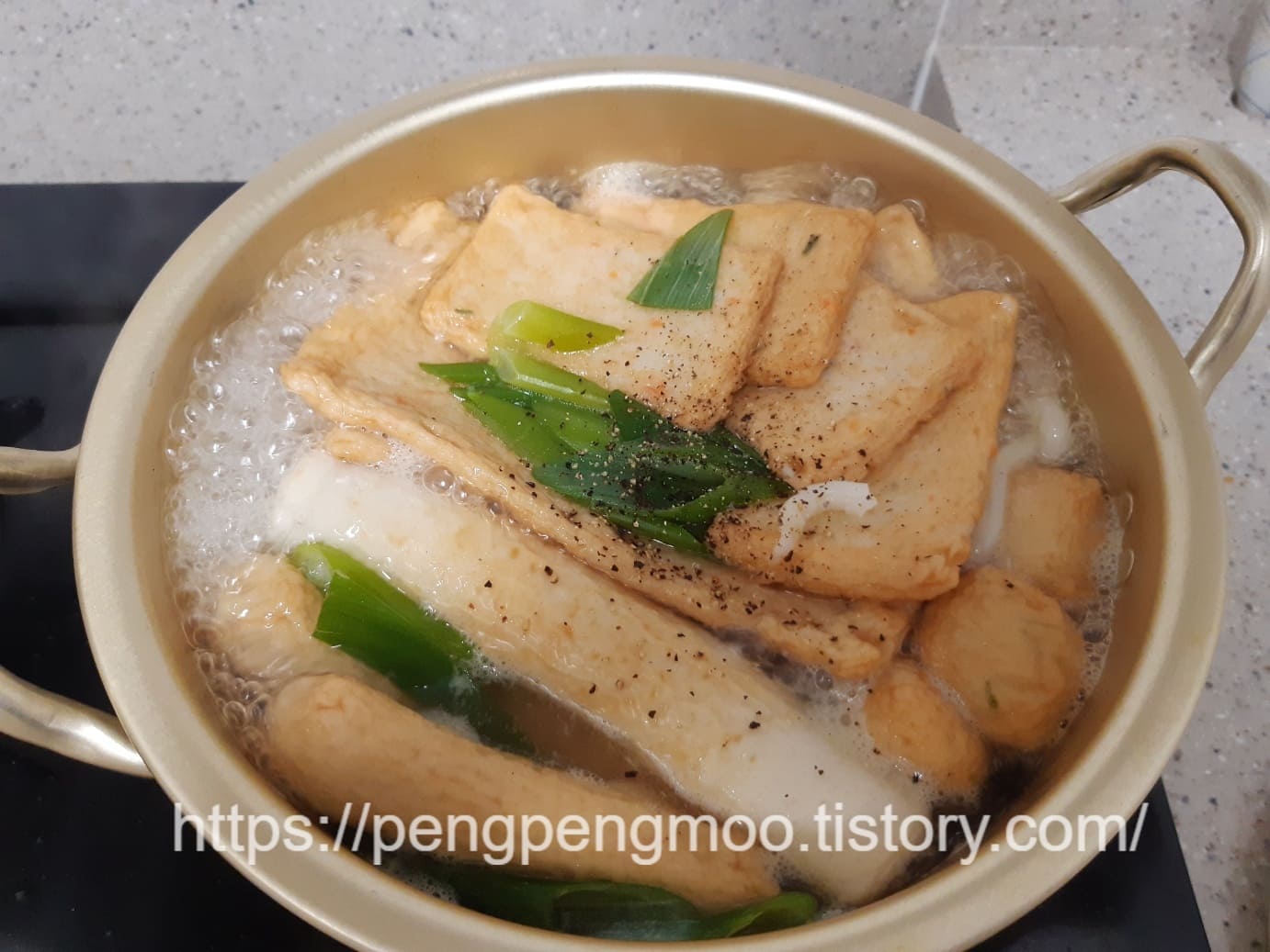 어묵과 스프를 넣고 집에 있던 파와 다진마늘도 조금 넣어주었습니다.